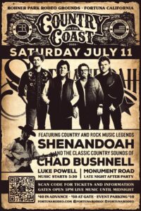 Country on the Coast opens Fortuna Rodeo Week Saturday July 11, 2026 with the legendary SHENANDOAH!